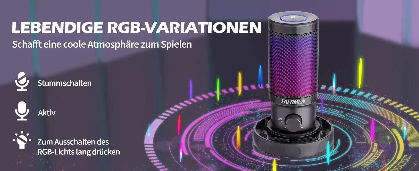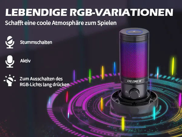 RGB-Farbänderungen lassen Sie automatisch in spezielle Gaming-Effekte eintauchen. Mit der Quick-Touch-Stummschalttaste oben können Sie das Mikrofon in einer Sekunde stummschalten. Erinnern Sie sich an den Betriebsstatus: RGB wird ausgeschaltet, wenn das Mikrofon stummgeschaltet ist (RGB ist nicht einstellbar, wenn das Mikrofon in Betrieb ist). Sie müssen sich keine Sorgen machen, dass der Ton beim Streaming abstürzt.