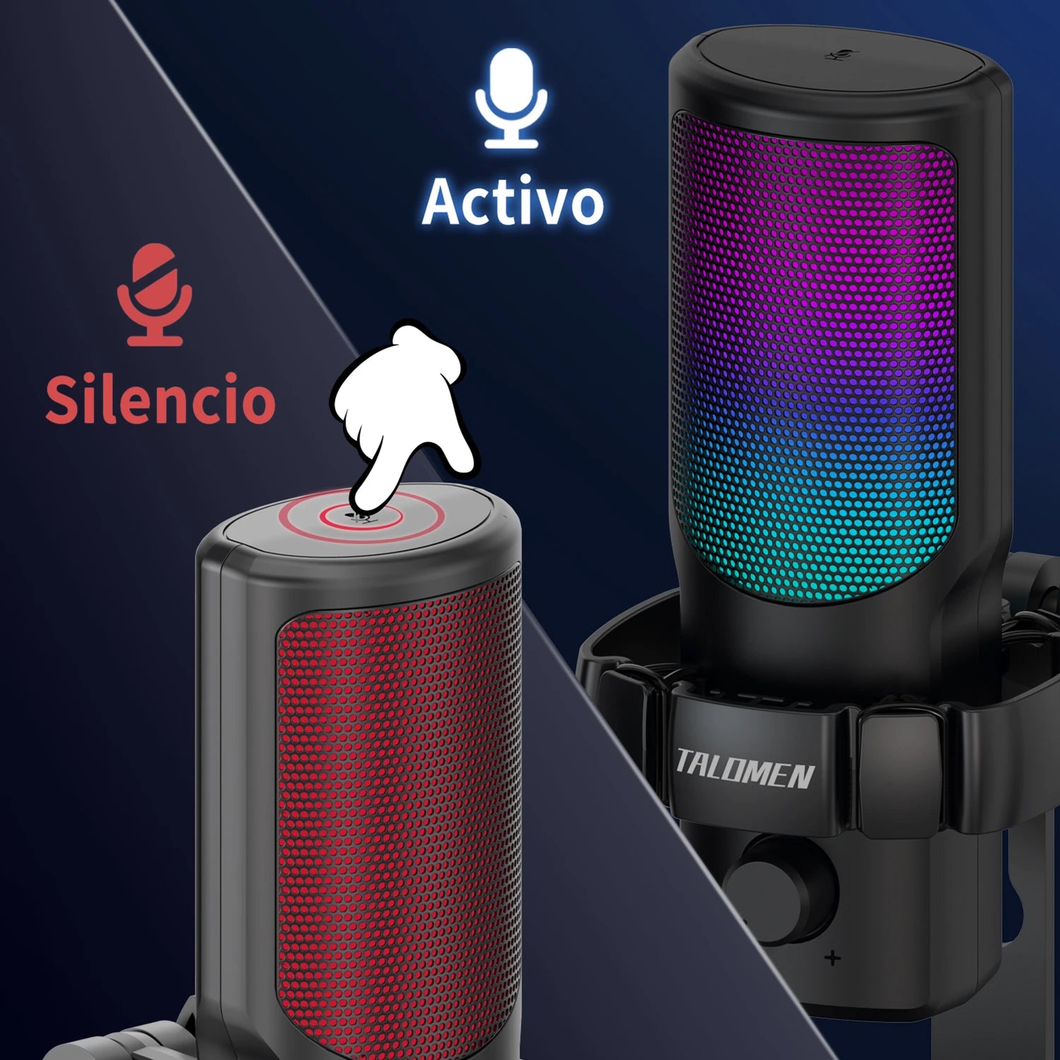 El micrófono para juegos USB Talomen cuenta con una iluminación RGB vibrante con siete modos de color, lo que crea una atmósfera de juego inmersiva.
