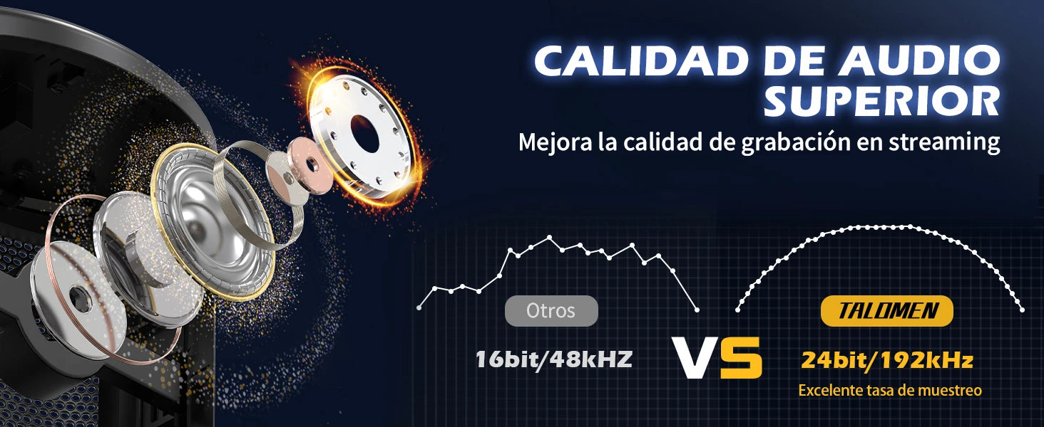 En comparación con otros productos del mismo tipo, el micrófono USB Talomen Eyas tiene una mejor frecuencia de muestreo de calidad de sonido, lo que realmente puede mejorar la calidad del sonido que transmite.