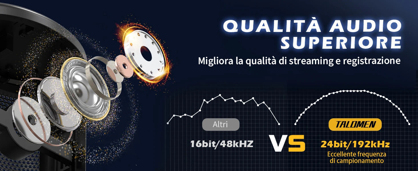 Rispetto ad altri prodotti dello stesso tipo, il microfono USB Talomen Eyas ha una frequenza di campionamento della qualità del suono migliore, che può realmente migliorare la qualità del suono trasmesso.