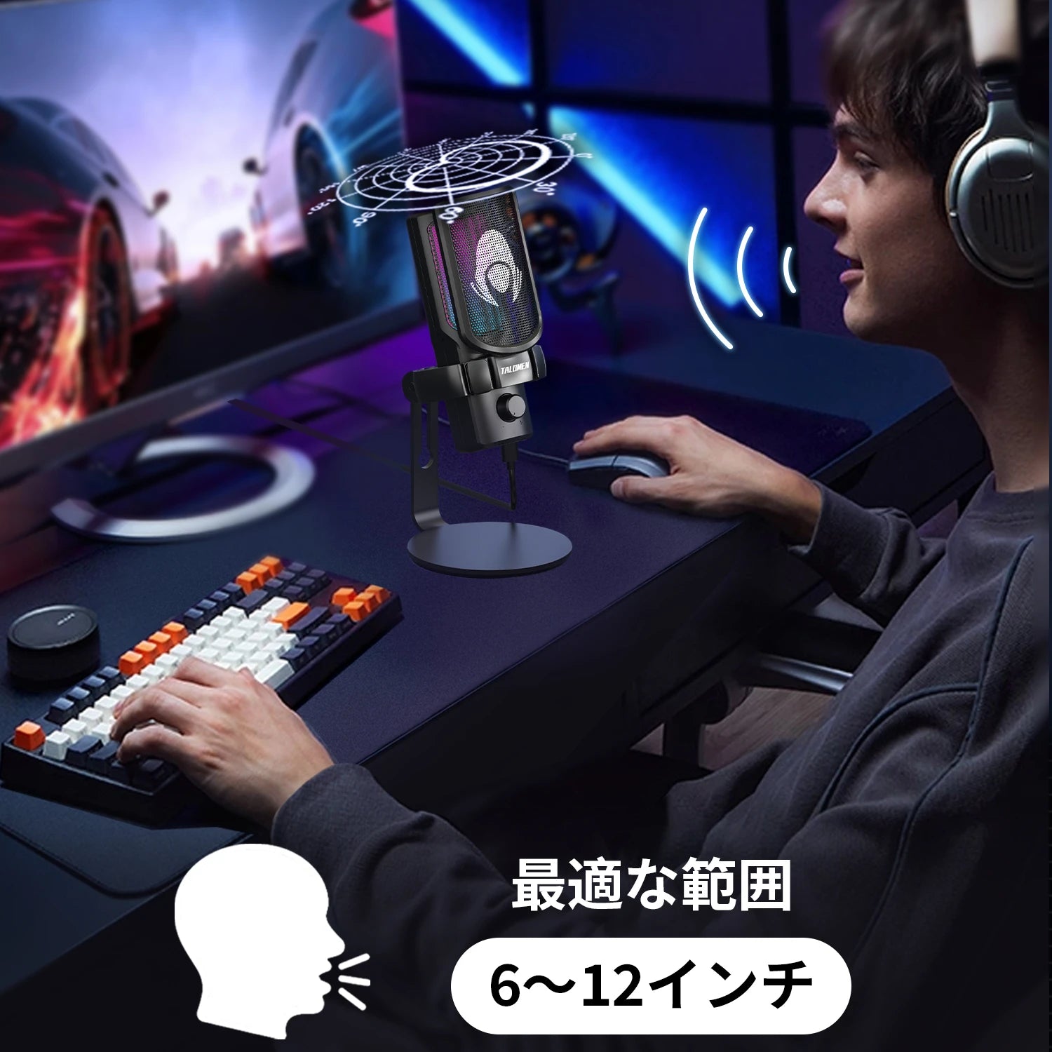 ストリーマーやゲーマーに最適な Talomen Eyas は、メインの音源に重点を置いたカーディオイド コンデンサー マイクです。騒がしい環境でも声をキャプチャして、全員が明瞭に聞き取れるようになり、チームメイトとのコミュニケーションが強化され、競争上の優位性が向上します。